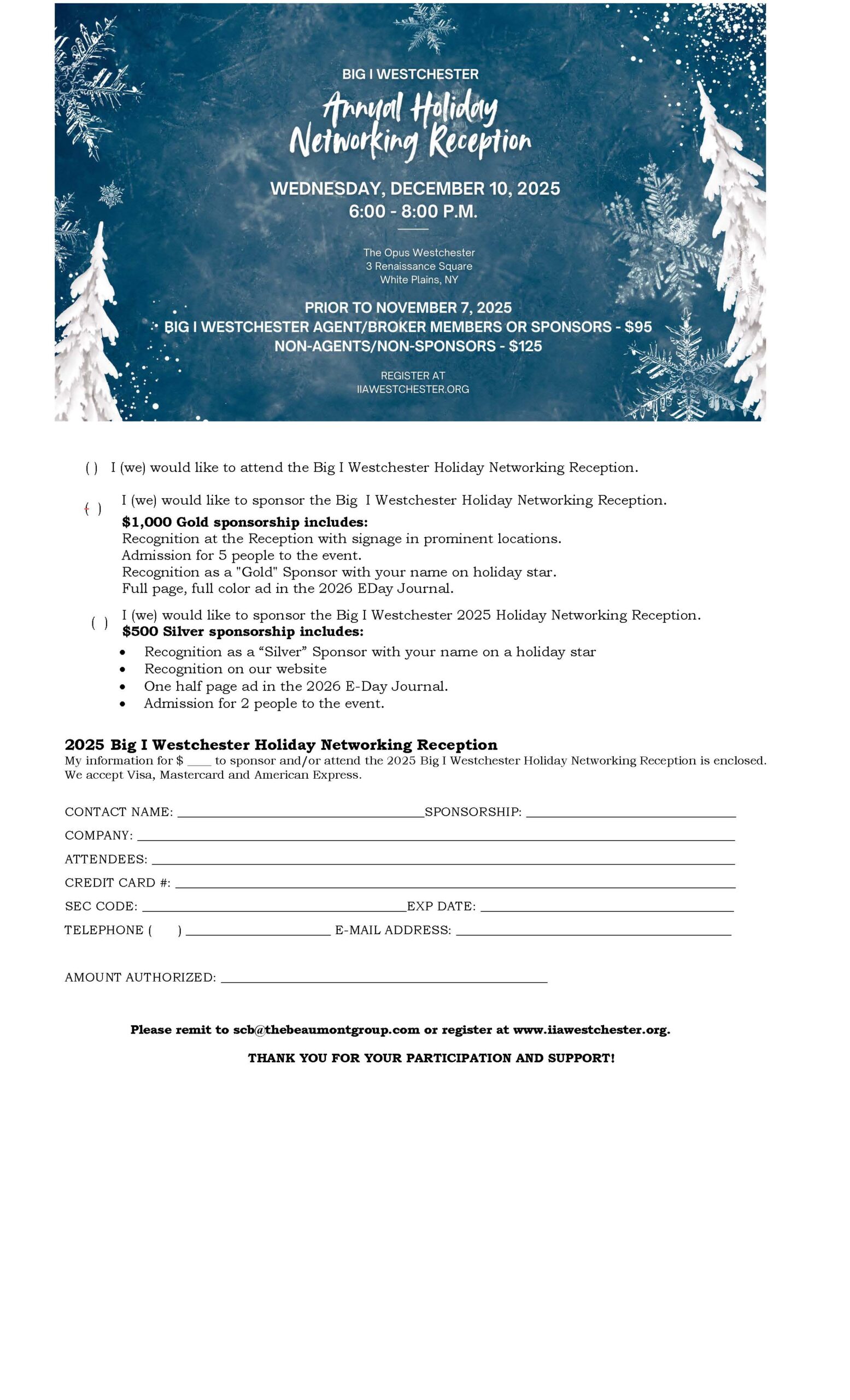2025 Holiday Networking Reception Posted on September 18, 2023October 13, 2025 by Susan Barros Our Holiday Networking reception for 2025 will be held at The Opus Westchester on December 10, 2025, from 6-8 p.m. 2025 Annual Holiday Networking Reception Holiday Networking Reception RegistrationSorry. This form is no longer available. Posted in Events.